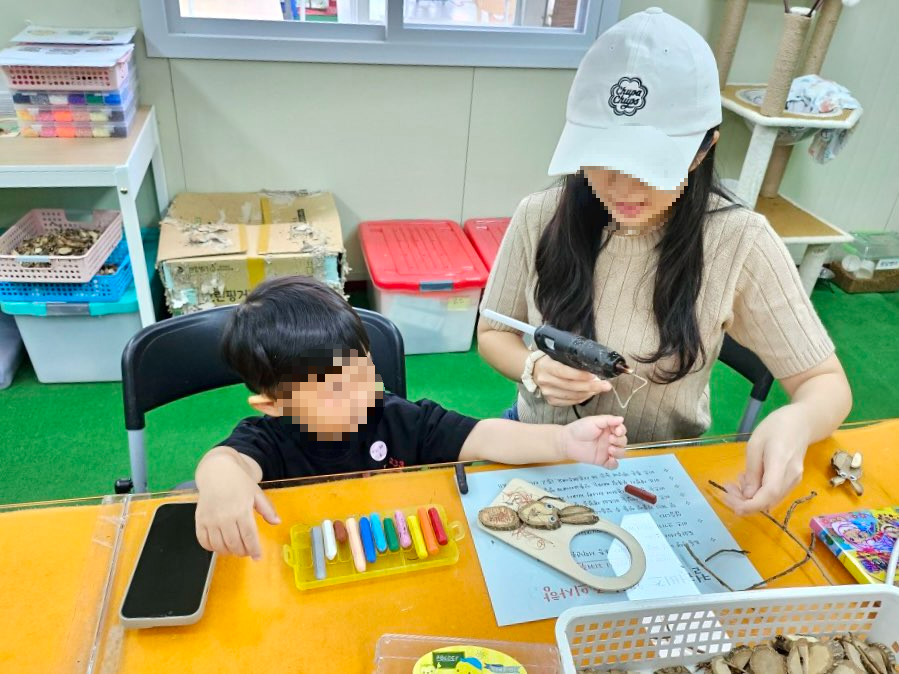 또뚝이는 나무공예를 선택했어요! 열심히 나무를 골라 글루건으로 만들어줍니다~