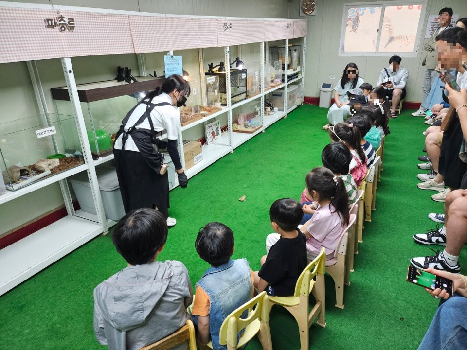 옆에 있는 파충류관으로 옮기면 동물들을 만날 수 있는데요! 작은 의자에 앉아있는 어린이들 너무 귀엽네요~