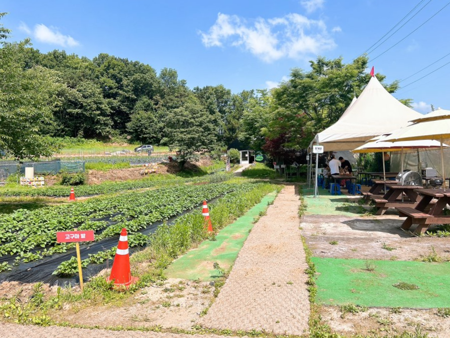 넓은 밭이 있구요, 고구마, 토마토 등 많은 작물이 자라고 있어요~